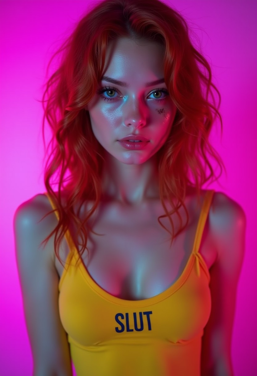 8k, realitic photo, natural lighting, 1girl, 18yo, beautiful girl, green eyes, red hair, curly hair, skinny, big breasts. neon purple background. ruined mascara, wearing yellow leotard with text " SLUT "