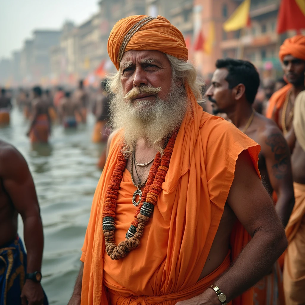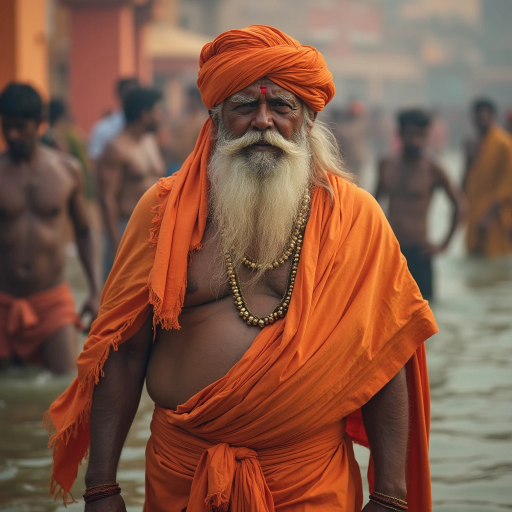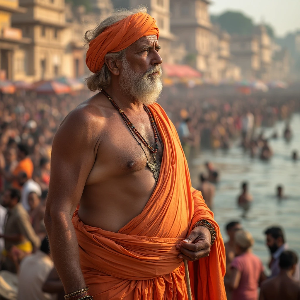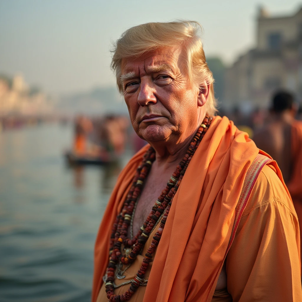 Donal trump wearing indian dhoti, look like indian baba, background varanasi ganga