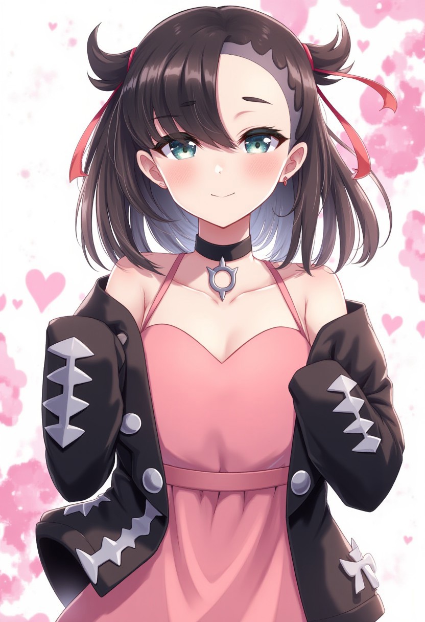 zzMarnie, black jacket, pink dress, hair down, black choker, looking at viewer, cleavage, collarbone, upper body, closed mouth, open jacket, off shoulder, head tilt, blush, hearts, abstract background, smile, looking at viewer,