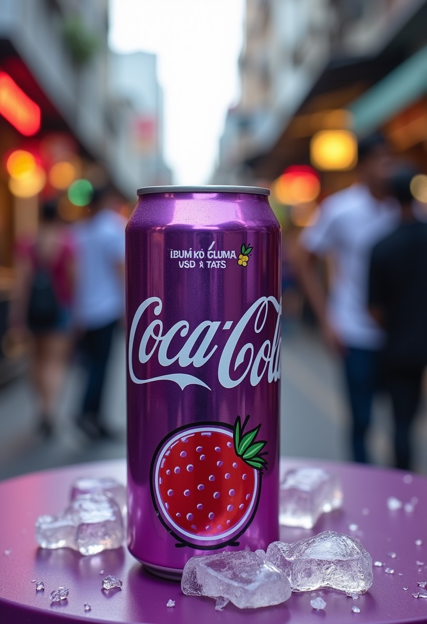 a product pack shot, product advertisement photo, a purple coca cola can with the text \"Coca Cola Devil Fruit\" with the image of Gum-Gum Devil Fruit print on the can, ice chilled can placed on a table with crowded bangkok street traffic background, short focus (/Pirate One Piece/)
