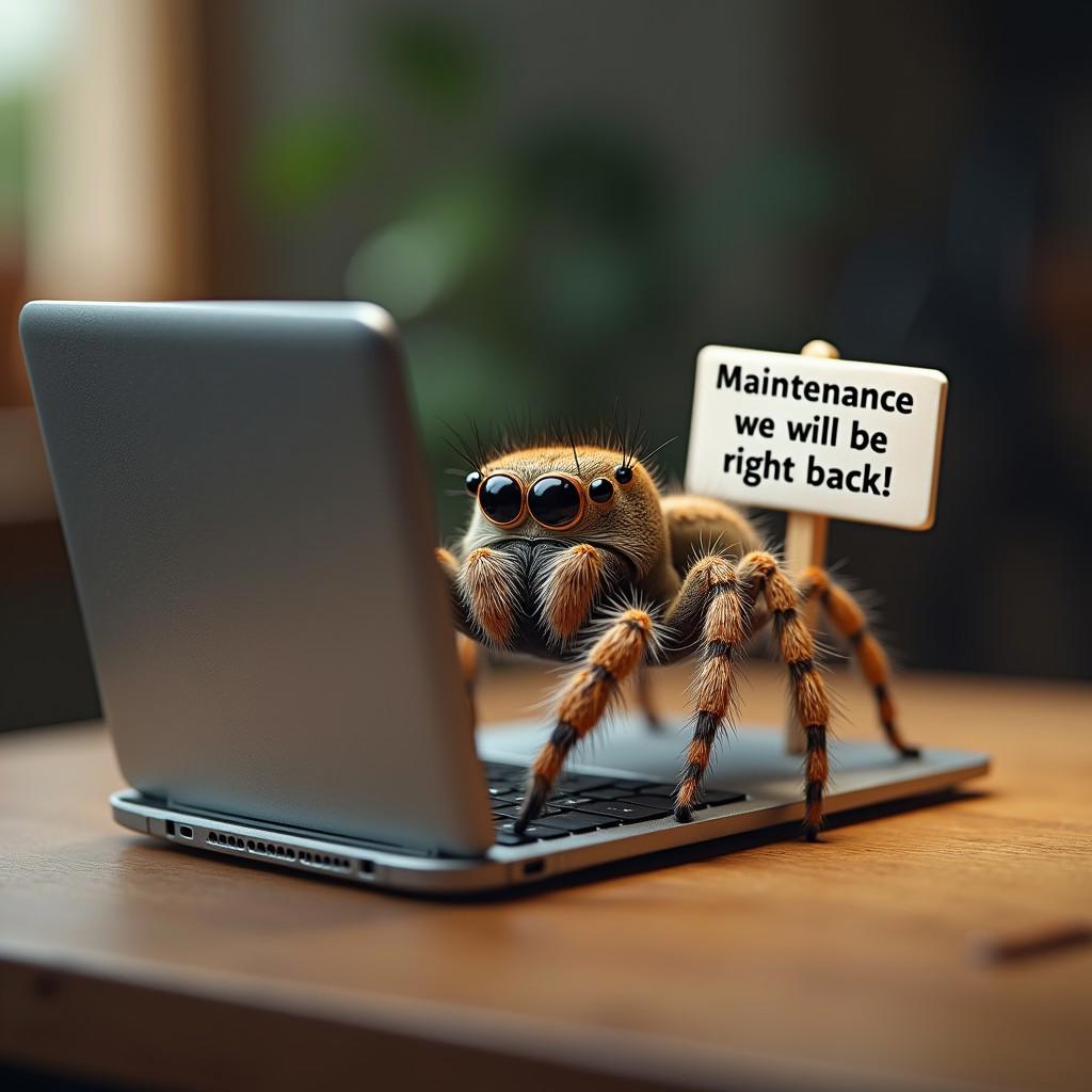 (ultra realistic,32k, ultrasharp,masterpiece:1.4),(high detailed skin:1.1),( high quality:1.1), (ultra high res:1.4), (masterpiece), (beautiful lighting:1.4), (dynamic angle:1.6), a cute jumping spider sitting at the laptop and holding a sign with (text "Maintenance, we will be right back!")