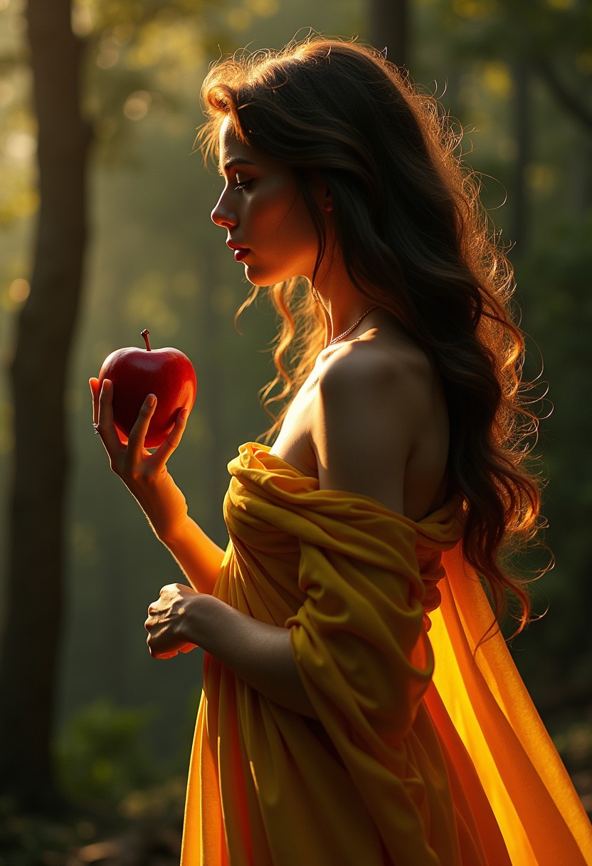 The first woman of time, Eve, a serpent tempting her with a apple, beautiful tall woman, warm light of clothing, light providing skin cover, no cloth clothes, photo realistic, subsurface scattering, Photorealistic, Hyperrealistic, analog style, realistic, film photography, soft lighting, photo, cinematography, high resolution, 8k, incredible photo, award winning photography