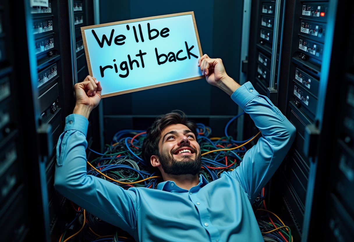 man lying in a pile of wires and cables holding up a sign that says "we'll be right back", server room, wires, cables, led lights