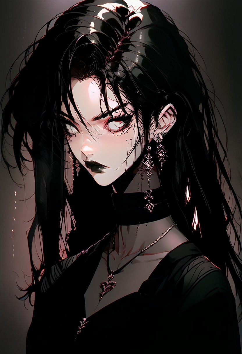 score_9, score_8_up, score_7_up, score_6_up, gthan, anime girl, best qulity, black hair, long hair, straight hair, red eys, black lipstick, necklace, earrings, black outfit, dark background,3DMM