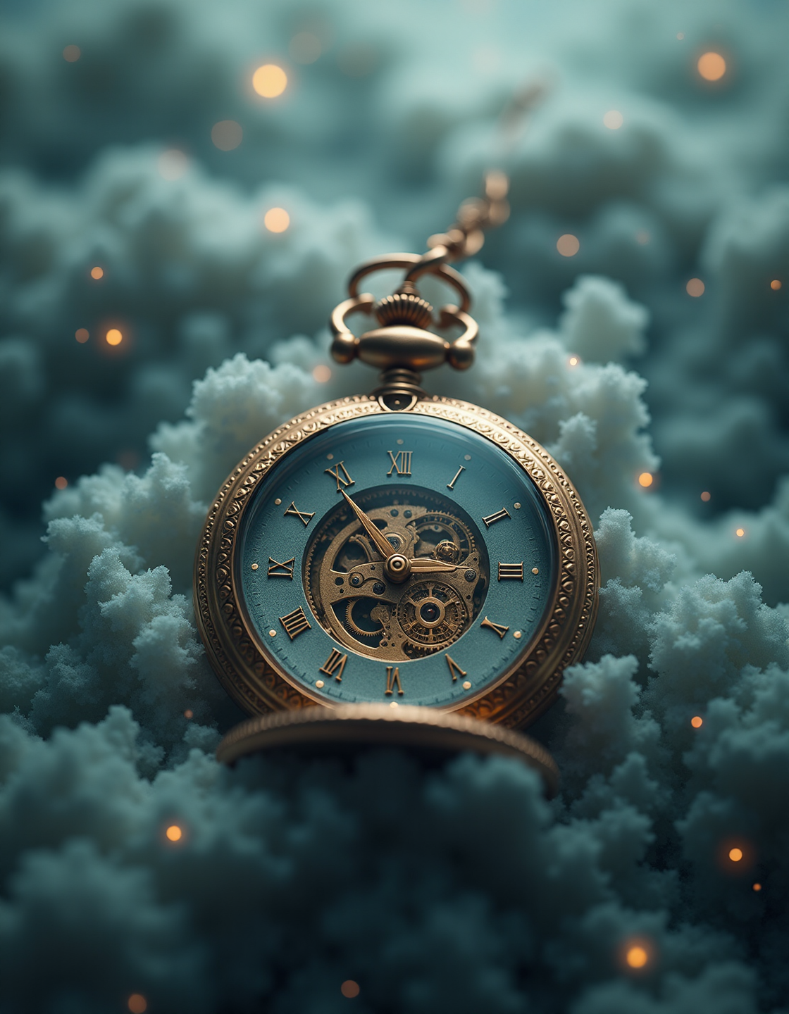 Visualize an ancient pocket watch floating in an endless expanse of swirling mist. The watchâs face is partially transparent, revealing intricate gears made of delicate crystal, slowly turning in a rhythm that syncs with the heartbeat of the universe. Each tick releases a ripple in the mist, creating patterns that resemble constellations and galaxies, flickering with soft, ethereal light. The watch's hands, instead of numbers, point to abstract symbols that change fluidly, representing concepts like memory, dreams, and forgotten time. Surrounding the watch, faint echoes of past moments and future possibilities shimmer briefly before dissolving into the mist. The entire scene is a blend of the mechanical and the mystical, evoking a sense of timelessness and the interconnectedness of all things.