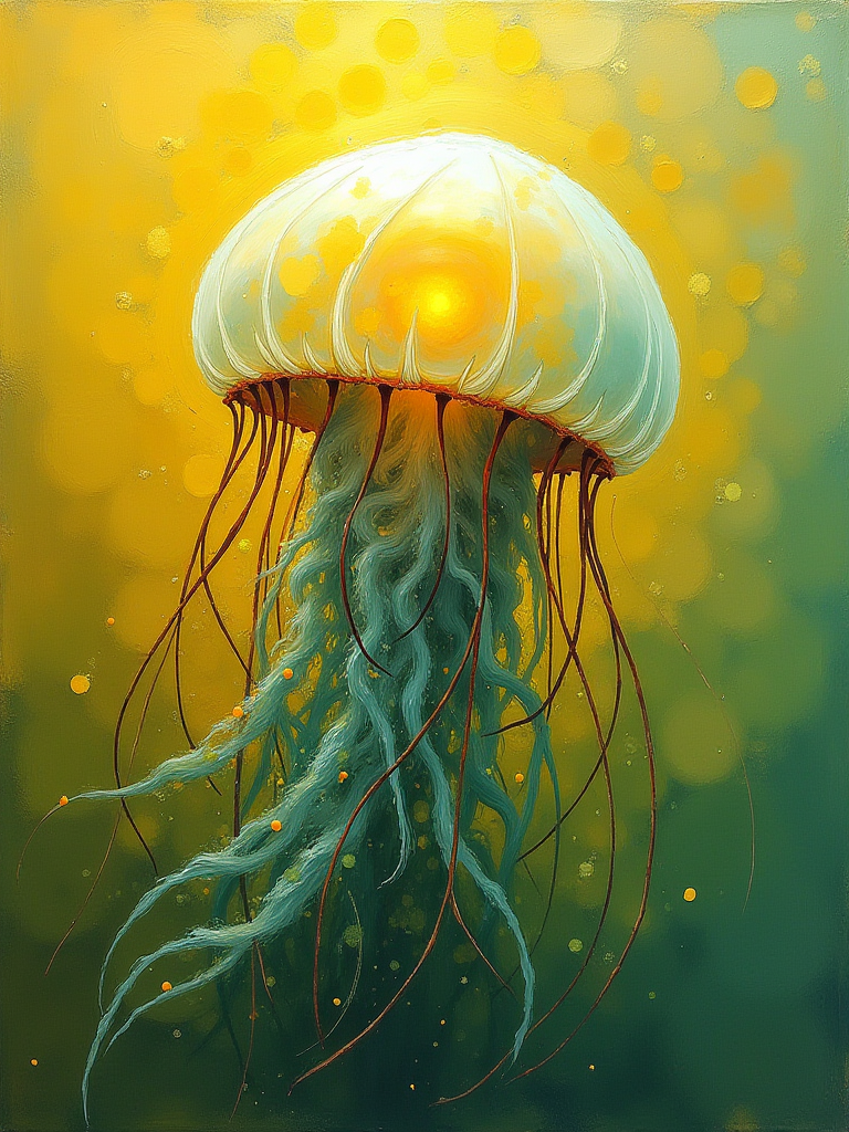 A surreal abstract depiction of an opalescent jellyfish, set against a chaotic backdrop of swirling circular brushstrokes in shades of yellow and green. The subject's features blend seamlessly into the magnificent canvas, as if painted by the same strokes that splash across its tentacles, masterpiece, best quality, highres,