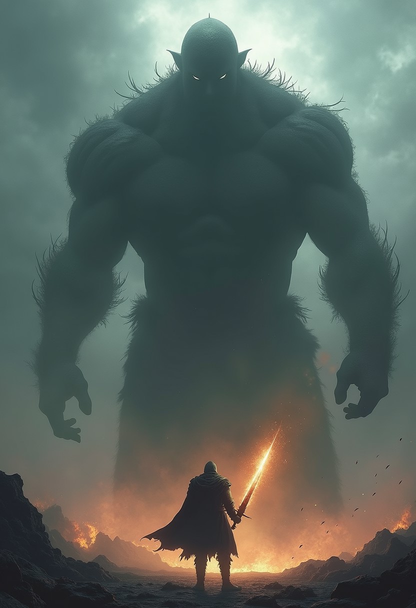 a solitary hero facing a massive foe, confronting an insurmountable challenge without flinching. The warrior’s (burning sword) symbolizes his inner conviction and unyielding spirit, while the giant’s shadow forebodes the difficulties and unknowns that lie ahead. This is a battle destined to be remembered in history—a final showdown of strength and wisdom, embodying the essence of what many consider humanity's greatest Souls game: to fight to the last breath in the face of fear and despair.