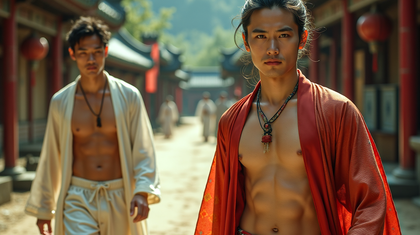 ancient Chinese young male noble, wearing an open shiny semi transparent colorful silk robe showing his chest and belly, pubic hair, he walks besides an ancient Chinese peasant wearing white cotton short pants and an opened white cotton shirt showing his chest and his belly, barefoot, full body shot, action shot. analog film photo, sharp focus., 2160p, 4k, detailed skin, movie poster, looking into camera, ultra detailed eyes, wet lips, exquisite craftsmanship, hdr, masterpiece, shot with a Nikon Z7 II, macro lens, shallow depth of field, warm and natural tones. Kodachrome, Lomography, stained, highly detailed, sharp background details. 4K, best quality, very detailed face