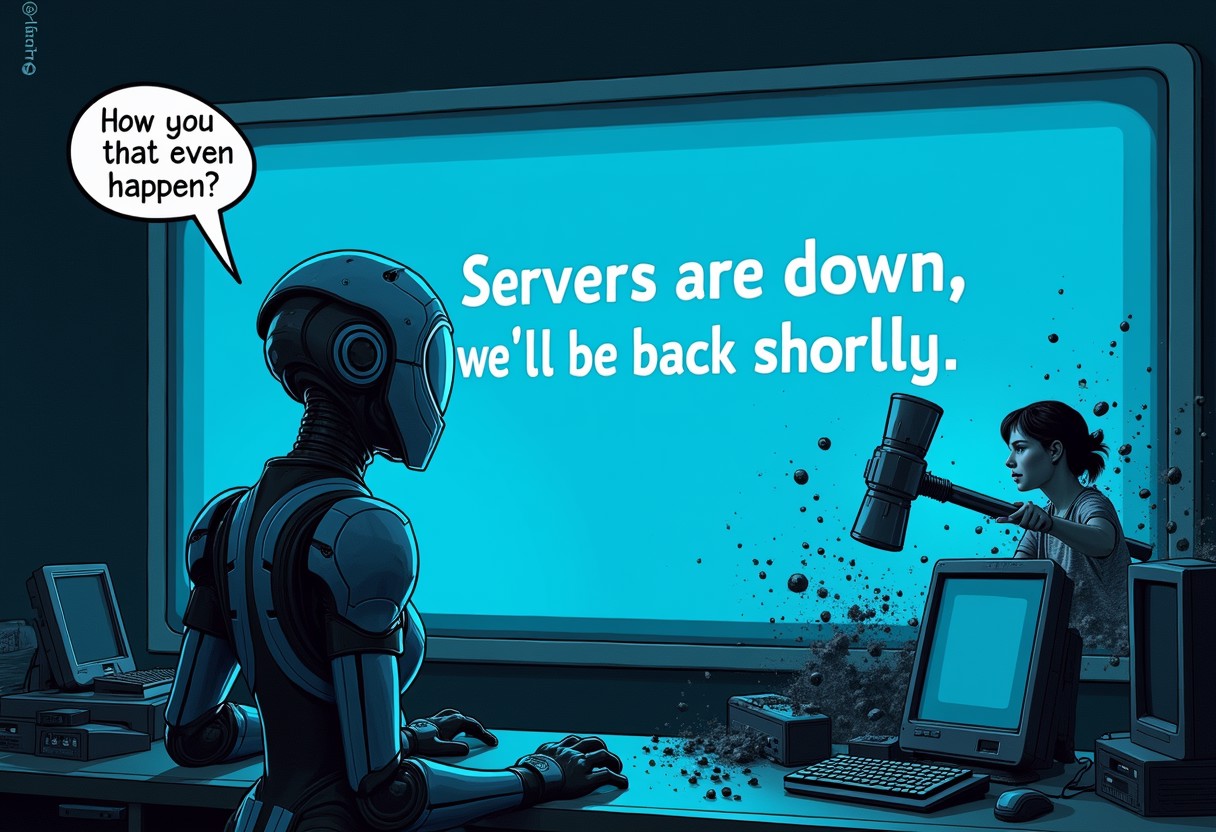 realistic, Glados from the Portal games looking at a monochrome blue screen with the text "Servers are down, we'll be back shortly", Glados has a monologue bubble with the text "How did that even happen?", a girl in the background is smashing some computers with a giant comical hammer