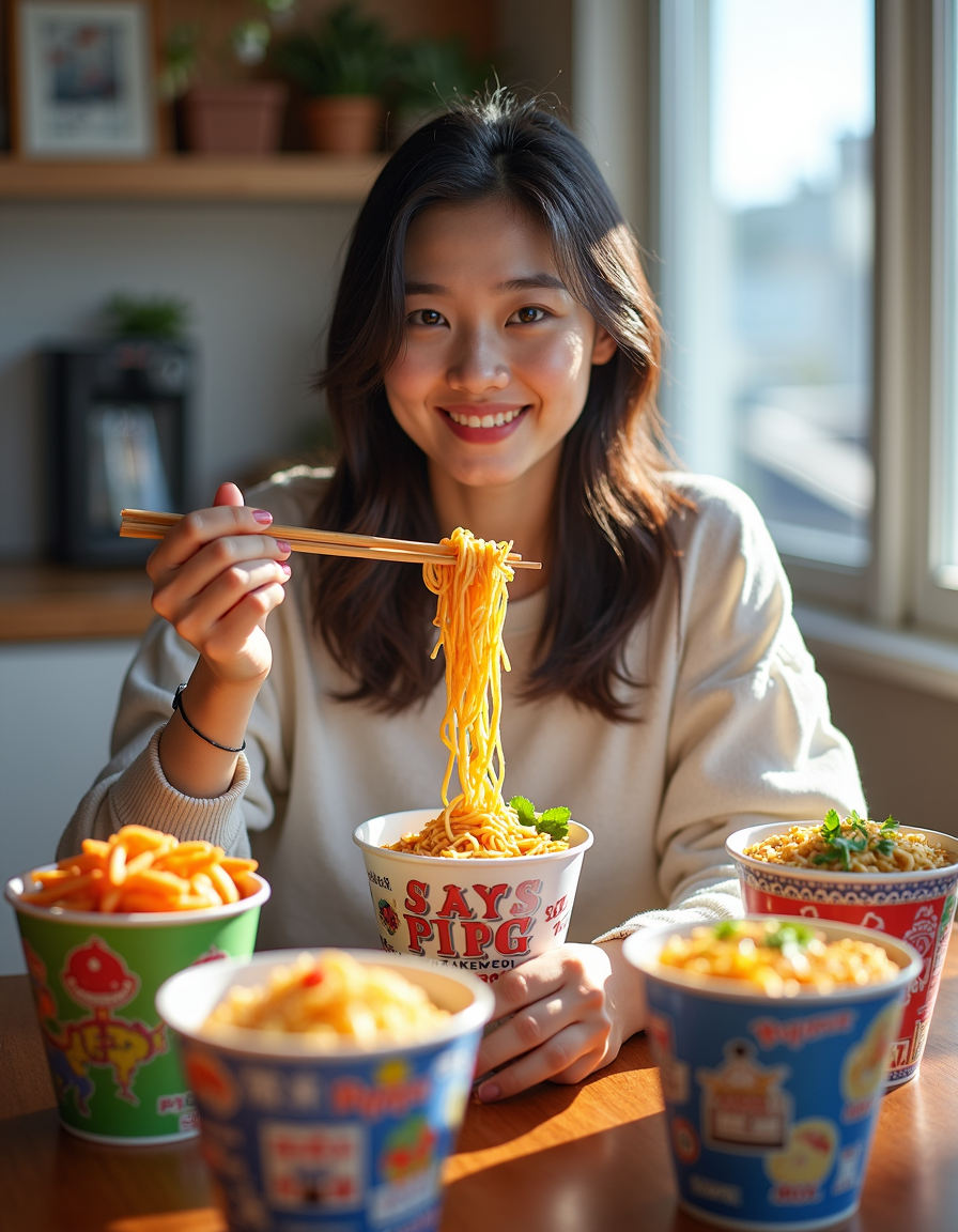 a young woman eating cup noodles. There are other cup noodles from other countries on the table.