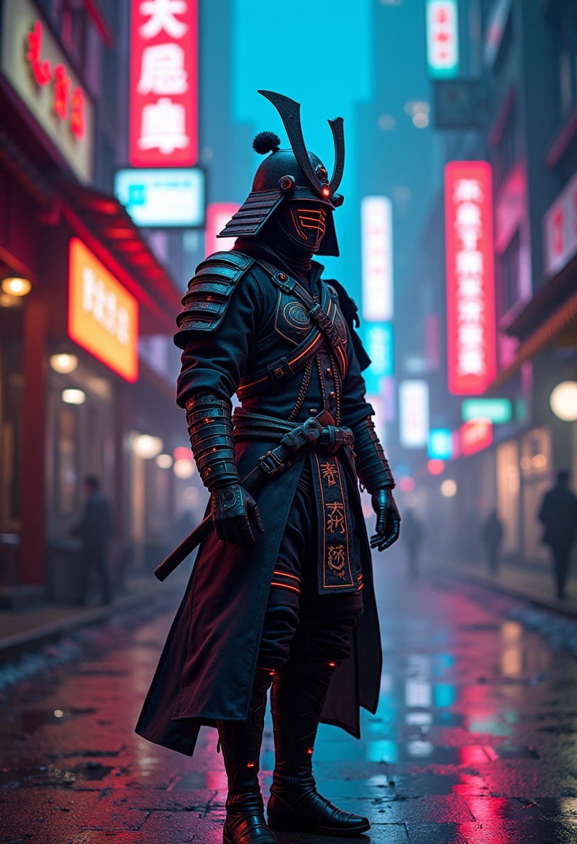 A cyberpunk ((samurai)) stands on the streets of a (distopian) futuristic city. His clothes shine with (neon) filaments revealing his cybertech improvements. He looks around as the dangerous ((streets)) impose ongoing menance.