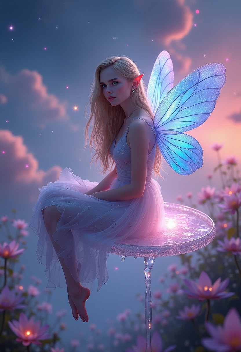 A captivating fantasy elf Emma Watson portrait set in a surreal, floating garden in the sky. The elf, with iridescent, translucent wings like those of a dragonfly, sits gracefully on a floating crystal lily pad. Her flowing hair shimmers with every color of the rainbow and cascades down, merging with the floating flora around her. Her eyes are deep pools of starlight, and her delicate, silver gown is adorned with tiny, twinkling constellations. The garden is filled with glowing, bioluminescent flowers and whimsical, hovering orbs of light. The backdrop features a swirling nebula sky with vibrant hues of pink and purple, creating a dreamlike, cosmic atmosphere. The portrait combines elements of ethereal beauty and celestial wonder, blending fantasy with a touch of otherworldly magic.
