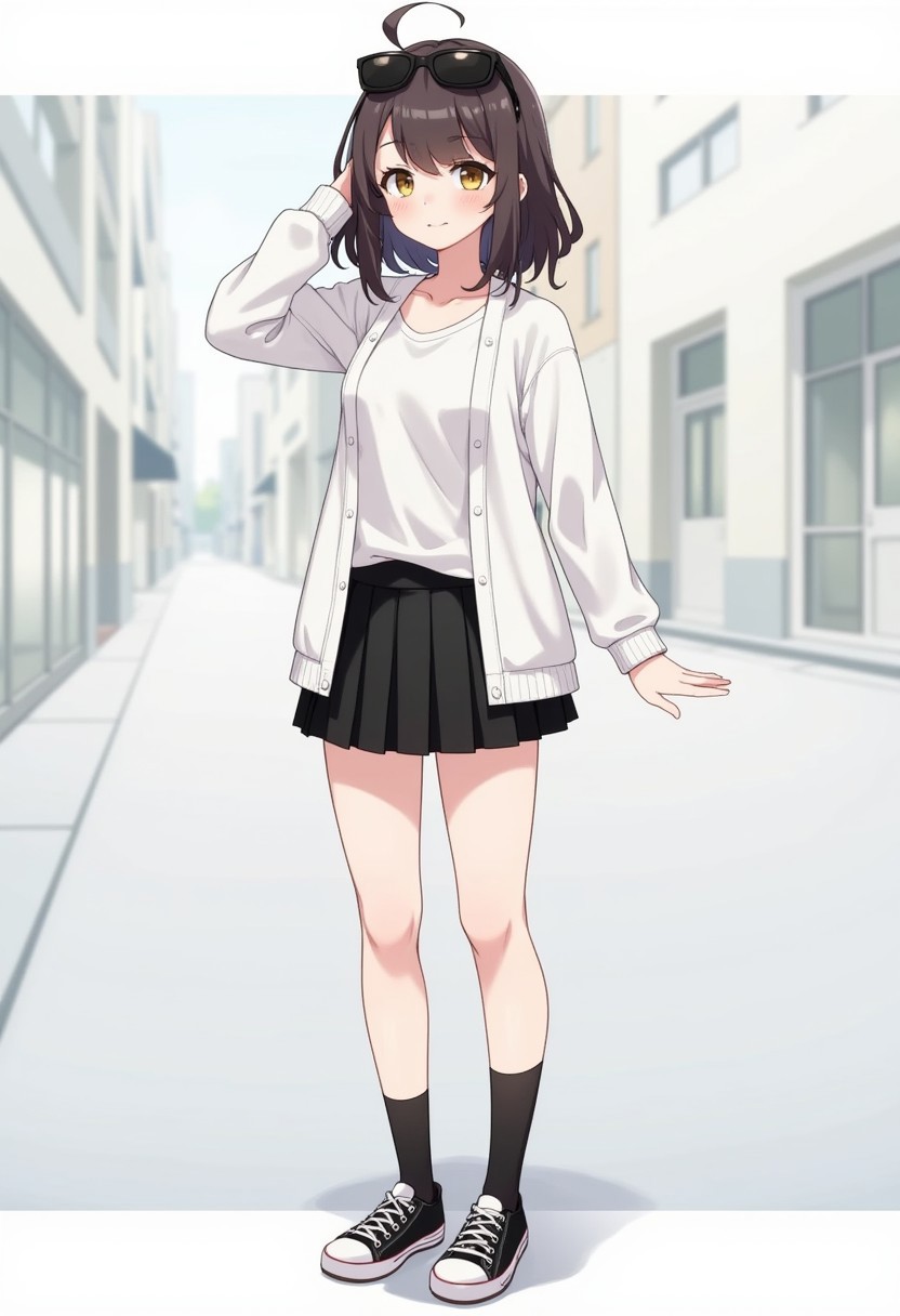 fca_style,anime,a stylish girl in summer attire, wearing sunglasses on top of her head, wearing a white sheer cardigan and a black box mini pleated skirt, and black socks and black sneakers. It has a fresh look suitable for a summer city.