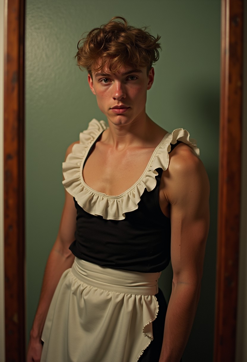 A mirror selfie of an athletic 20 year old male, with photo grain, dim soft lighting and an authentic feel. He is wearing a French maid outfit with frills and a skirt, with a playful smirk.