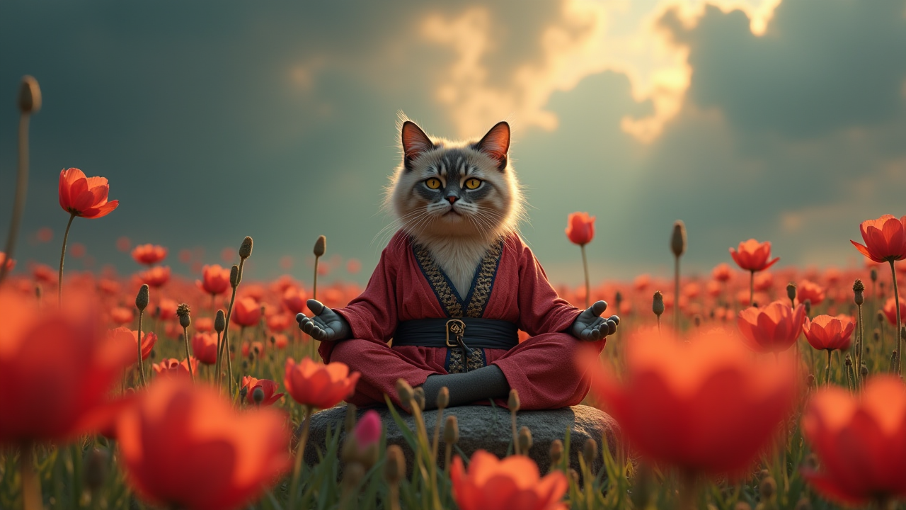 Greedy, a wise Shabby Chic Exotic Shorthair Cat Pirate captain meditating on a Literal Brunei above a Impressive Poppy field, wearing Hostile robes, surrounded by great composition lotus space, Pathetic expression, Spirit World moody lighting casting a Disheartened glow on the scene