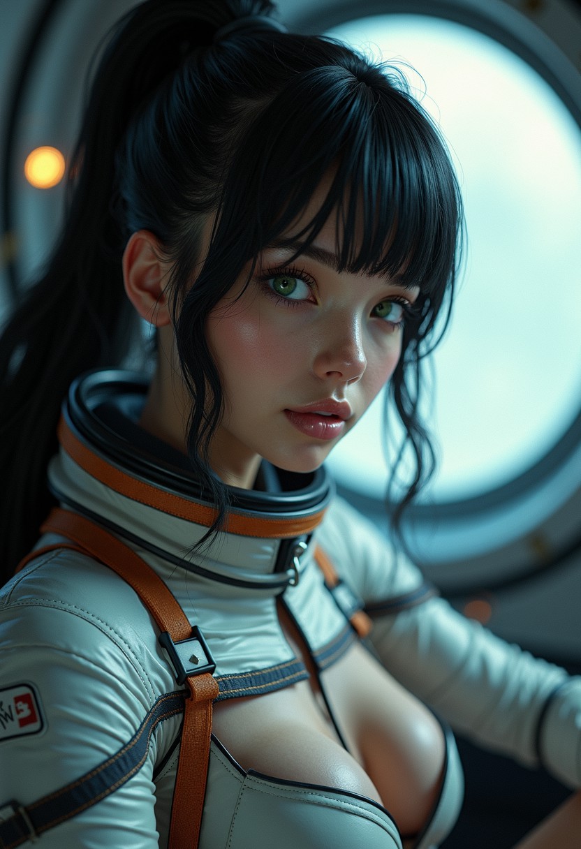 hyper realistic woman, black hair, spacesuit, shiny skin, cleavage, astronaut, ponytail, bangs, green eyes, in international space station, tilted angle, moody lighting, flouting, suggestive pose, window, professional lighting, science fiction, perfect quality, high quality, photorealistic, sitting BREAK orange and blue hue, (abstract:0.2)