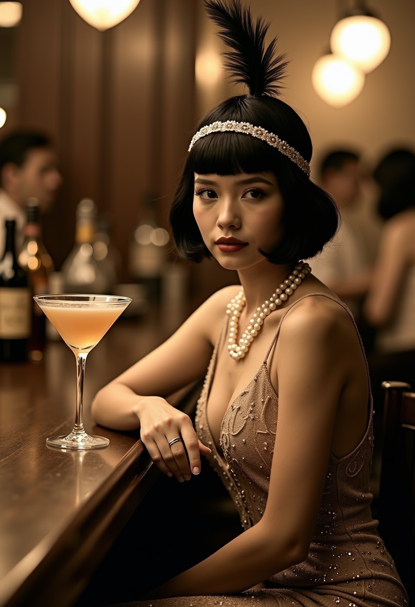 A sepia-toned photo of a glamorous young woman from the 1920s, with bobbed black hair and a feathered headband, sitting elegantly at a dimly lit speakeasy bar. She wears a shimmering flapper dress with intricate beadwork, holding a cocktail glass in one hand. The background features dark wood paneling, a polished bar with vintage bottles, and faint figures of other patrons. The lighting is soft and diffused, casting a warm glow on her face, highlighting the pearls around her neck. The camera angle is at eye level, capturing her upper body, with a slight focus on the vibrant atmosphere of the speakeasy. The photo is shot with a 50mm lens, creating a nostalgic, cinematic feel, reminiscent of the era’s photography.