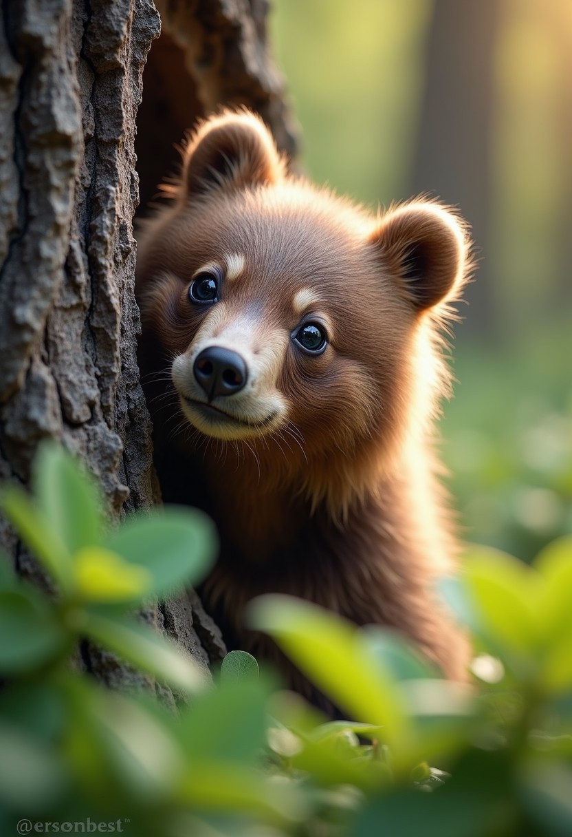 A small bear peeks out from behind a (rough tree trunk), its (soft brown fur) blending seamlessly with [the surrounding trees], expressing a natural curiosity and innocent charm. The bear’s (eyes sparkle with warm brown light), showing a hint of mischief and curiosity as if it’s quietly observing the outside world. The (lush green foliage) in the foreground softly outlines a peaceful forest scene, filled with tranquility and natural innocence. The bear’s (brown and gray fur) appears especially warm and cozy in the gentle light, conveying a sense of carefree ease.