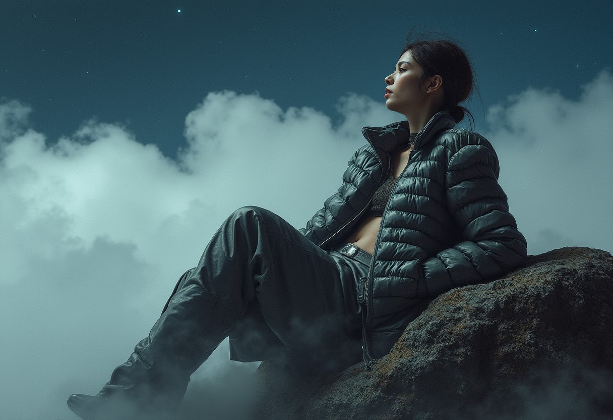 Fashion photography scene: A surreal, otherworldly setting featuring a skinny female model with a strong, ethereal presence. The scene is set against a dramatic backdrop of swirling clouds and a starlit night sky. The model is dressed in oversized, futuristic outerwear with a quilted texture and metallic sheen. Her pose is relaxed yet powerful, reclining on a rocky terrain that seems to float among the clouds. She gazes off into the distance with an air of mystery and contemplation. The lighting is soft, casting a subtle glow on her skin, while the clouds and mist around her add depth and dimension to the image. The overall mood is dreamlike, blending elements of fantasy and high fashion, creating a striking visual narrative that feels both grounded and otherworldly.