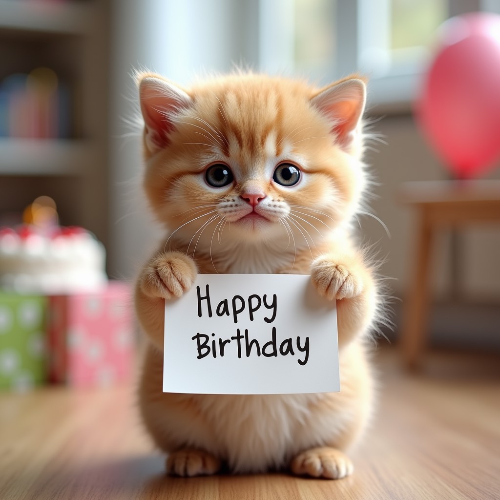 kitten, cute eyes, fluffy kitten, fat kitten, cuddly kitten, cute, adorable, innocent eyes, happy, ((((holding sign saying "happy birthday")))), kids birthday party, kids playplace, birthday, birthday cake, innocent,hyper-realistic photograph