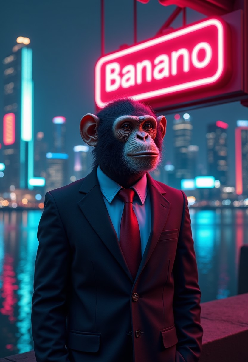 A monkey in business suit in a sci-fi city by night, neon sign that says "Banano" reflecting into the water
