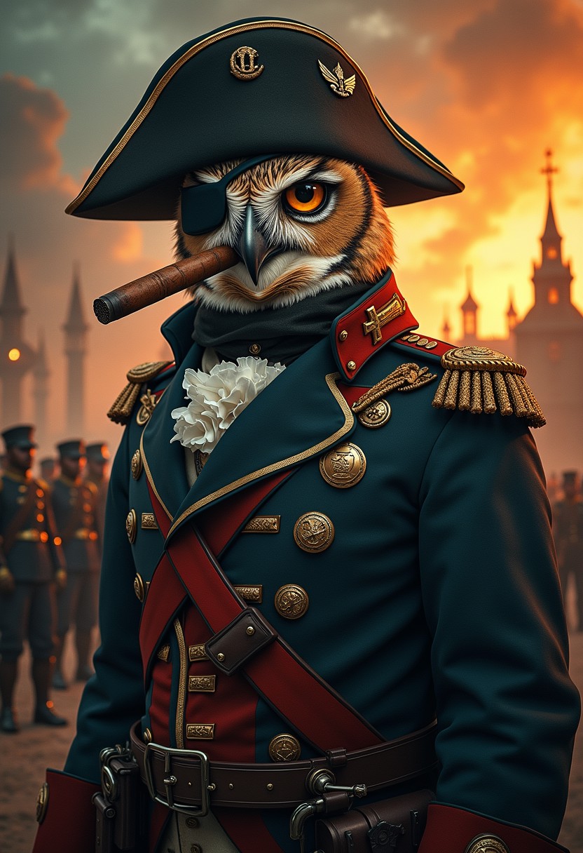A propaganda poster tiled "Global warming menace" . The poster features a portrait of a humanoid owl with one eye blidfold and wearing a napoleonic chivalry soldier uniform, a prussian helmet , smoking a cuban cigar, standing with hands behind his back, several scars on face, the expression is intense as if he is Napoleon himself, dramatic lighting, cinematic frame. The overall color scheme of the poster is dark tones, in background a steampunk city at sunset, and various soldiers reloading a steampunk cannon