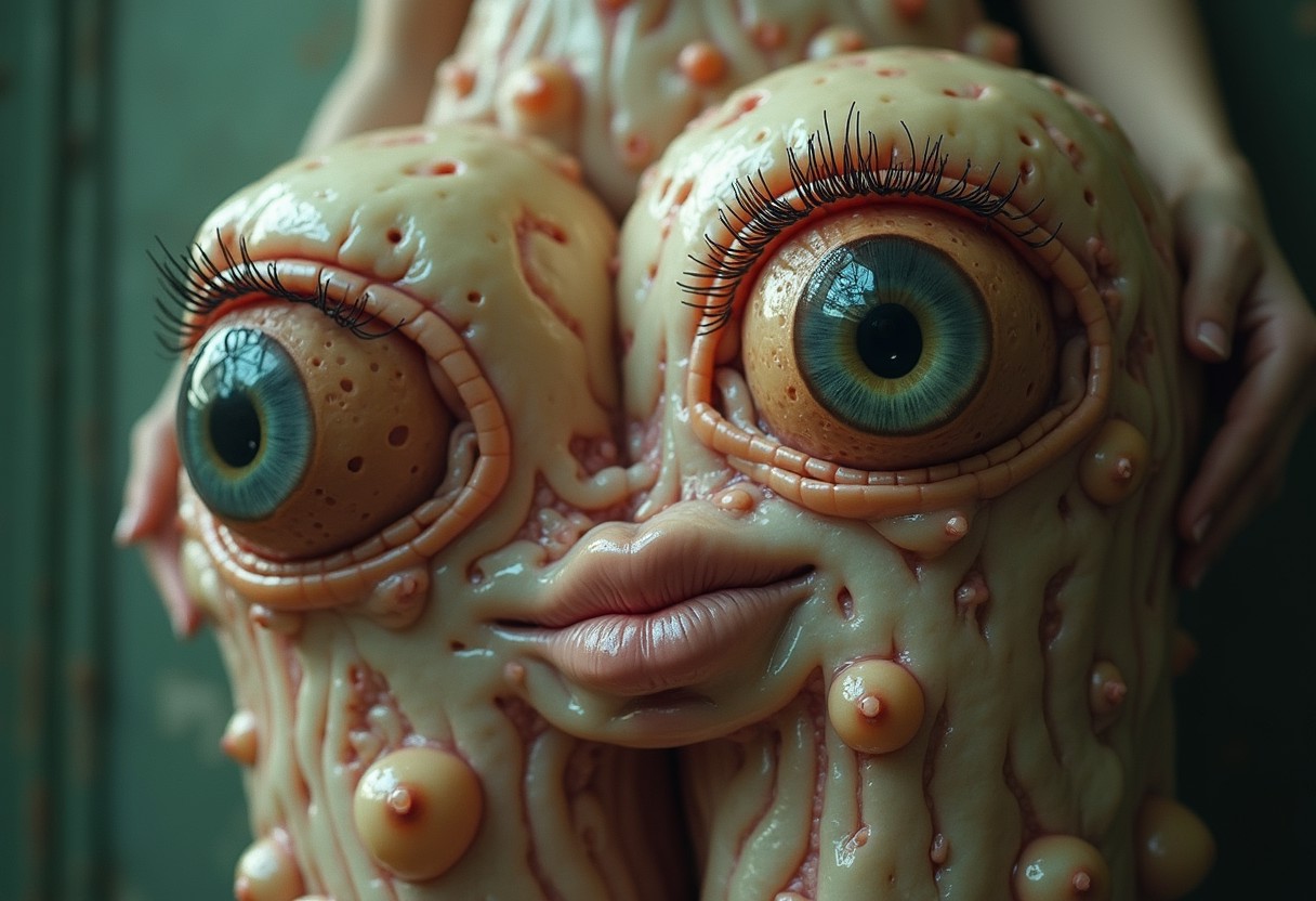 A surreal and highly detailed close-up shot, focusing on an unsettling yet captivating scene. The lower part of a person's legs are encased in grotesque, otherworldly organic formations resembling flesh with large, realistic eyes embedded within the skin. The eyes have vibrant irises and long, exaggerated eyelashes, making them appear eerily lifelike. The skin is textured with bulbous, translucent, glossy protrusions that give a strange, fluid-like effect. Above, a pair of smiling lips are unnervingly positioned in the lower face, adding to the disturbing yet fascinating vibe. The overall mood is a blend of surrealism, horror, and fine art, with hyper-realistic details that create an uncanny, dreamlike atmosphere.