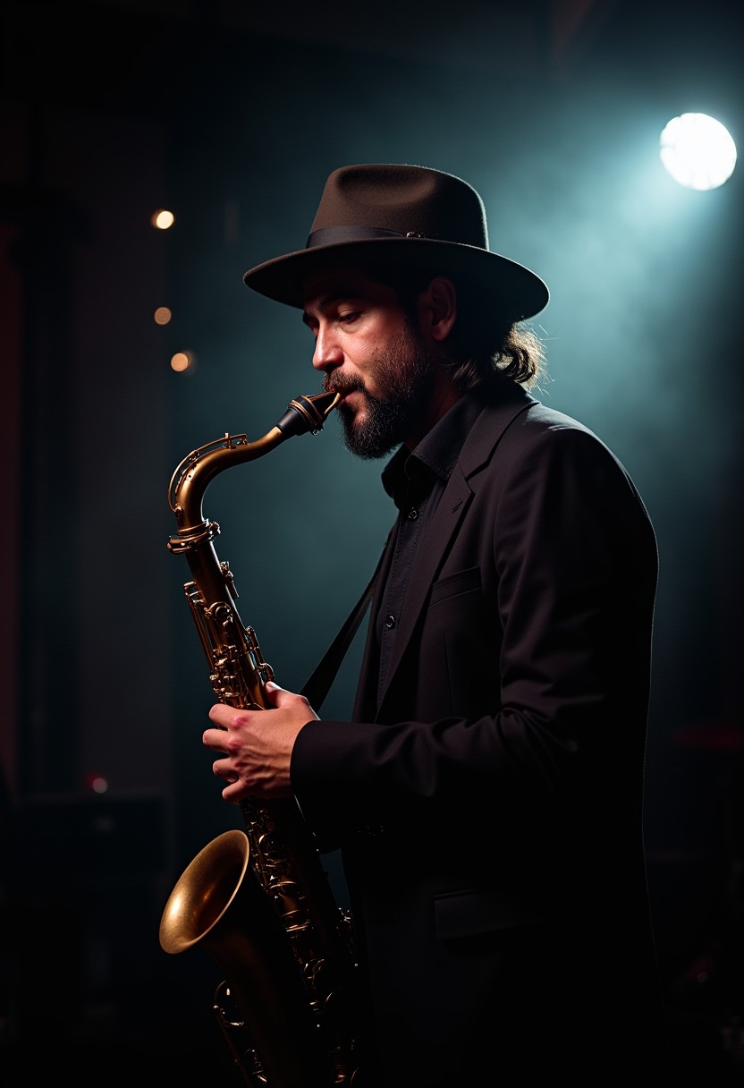 A soulful jazz musician plays a saxophone on a dimly lit stage. Smoky club, spotlight, musical notes, fedora, vintage microphone, dramatic shadow, extreme close-up, portrait.