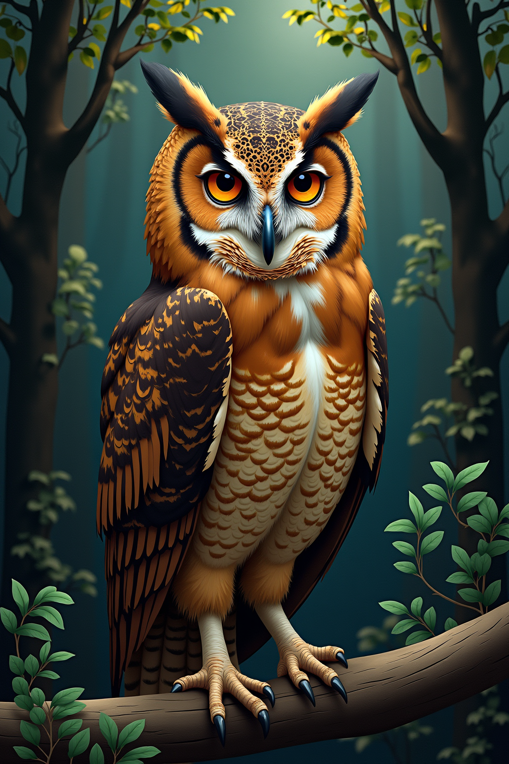 illustration, art by anna dittmann, portrait mixed with natural elements, In the heart of a dense forest, a majestic ironbeak Owl stands tall and proud. Its feathers are a deep brown, with intricate patterns etched into their skin. surrealism, center lighting, blank background, deep colors
