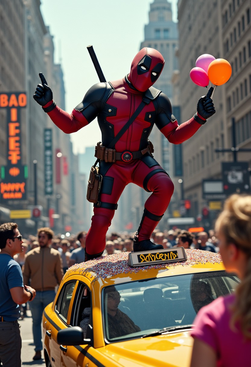 A high-resolution, photorealistic image of Deadpool in a humorous and chaotic scene. Deadpool is in his iconic red and black suit, striking a ridiculous and exaggerated pose. He holds a comically oversized foam finger in one hand and a colorful party horn in the other, mid-blow with his mask puffing out humorously. The background features a bustling city street with surprised and amused onlookers. Deadpool is standing on top of a taxi, with the driver looking up in bewilderment. Surrounding the taxi are scattered confetti, balloons, and a "Happy Birthday" banner hanging off the side, suggesting an impromptu celebration. There are also various humorous elements like a signpost with Deadpool-themed street names and a nearby hotdog stand with a "Chimichanga Special" sign. The composition follows the golden ratio, with a depth effect adding dimension and realism. The lighting is bright and natural, casting soft shadows that enhance the details of Deadpool's suit and the chaotic yet festive atmosphere.