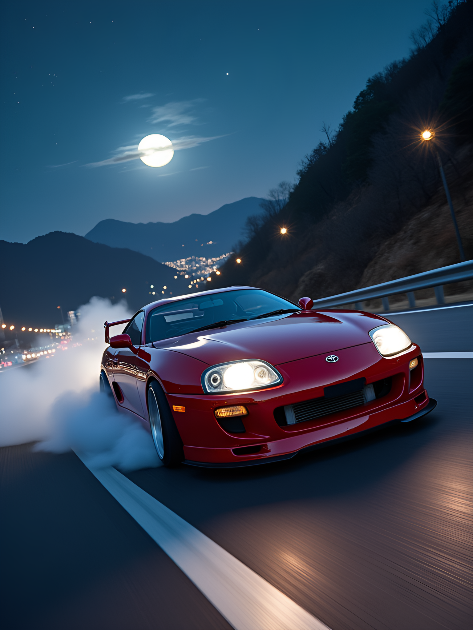 ultra realistic photo of Toyota Supra MK4,going down steering to side drifting on a curve of a street in a mountain in Tokyo, at night, city visible on background,starry sky, smoke from tires,high detail,depth of field, bloom, lens flare, cinematic style,shot from above,moon,car has custom JDM Wheels