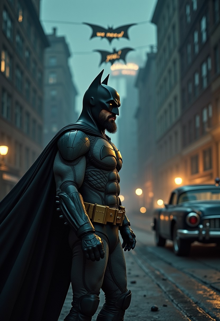 hi-def image, artistic frame in the same style of a movie poster, a tired and bearded Batman with an old heroic costume, up in the dark sky a bat-sign that says "We need you!", Batman running toward to his dusty batmobile, in the outskirts of a rundown gothic city,