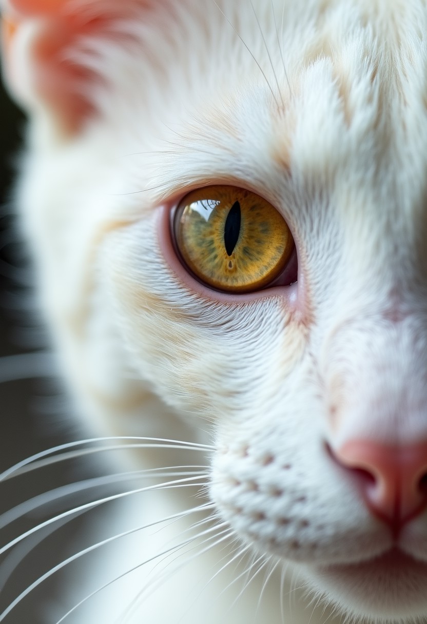 Extreme close-up half face of a white cat, direct frontal view. Detailed iris and pupil. Sharp focus on eye texture and color. Natural lighting to capture authentic eye shine and depth.