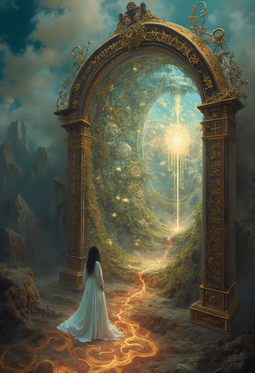In Salvador Dalí’s style, envision a top-down scene with an enormous grandfather clock, its pendulum frozen in a surreal, drippy arc. The clock’s face opens to reveal a portal glowing with an otherworldly bluish light. Inside, gears and cogs swirl in a liquid dance, suspended in timeless flux. Melting clock hands, entwined with arcane symbols, drip like wax, while glowing runes and living vines merge into the clock’s distorted frame, creating a hallucinogenic pattern. At the center, a young woman with porcelain skin and raven-black hair, back to the viewer, steps into the portal. Her white robe ripples and melts like liquid light, trailing as she enters the portal’s pulsating glow. Her sapphire eyes, wide with awe, reflect the portal’s shifting colors as she moves into a fantastical landscape: mountains with melting peaks, a volcano spewing twisted lava, and a river of steam winding through a charred, morphing forest. The grandfather clock rests on a dark, liquid floor that warps and ripples, mirroring the portal’s light. Above, a crescent moon oozes surreal luminescence, while stars float like dream fragments. The scene, with deep reds and blues, contrasts with the portal’s cool hues, enhanced by fluid, reflective lighting. The mood is hallucinogenic and dripping with distorted wonder, drawing viewers into the clock’s magical world, guided by the woman’s retreating form.
