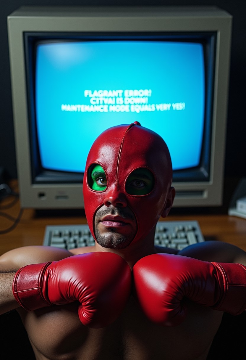 Looking at the back of the head of a masked luchador wrestler wearing red boxing gloves, the wrestler has green eyes and a red mask, the luchador wrestler is sitting in front of a computer monitor from the 1980s, computer monitor is showing a blue screen, blue screen showing text "FLAGRANT ERROR! Citvai is Down! Maintenance Mode Equals Very Yes!"