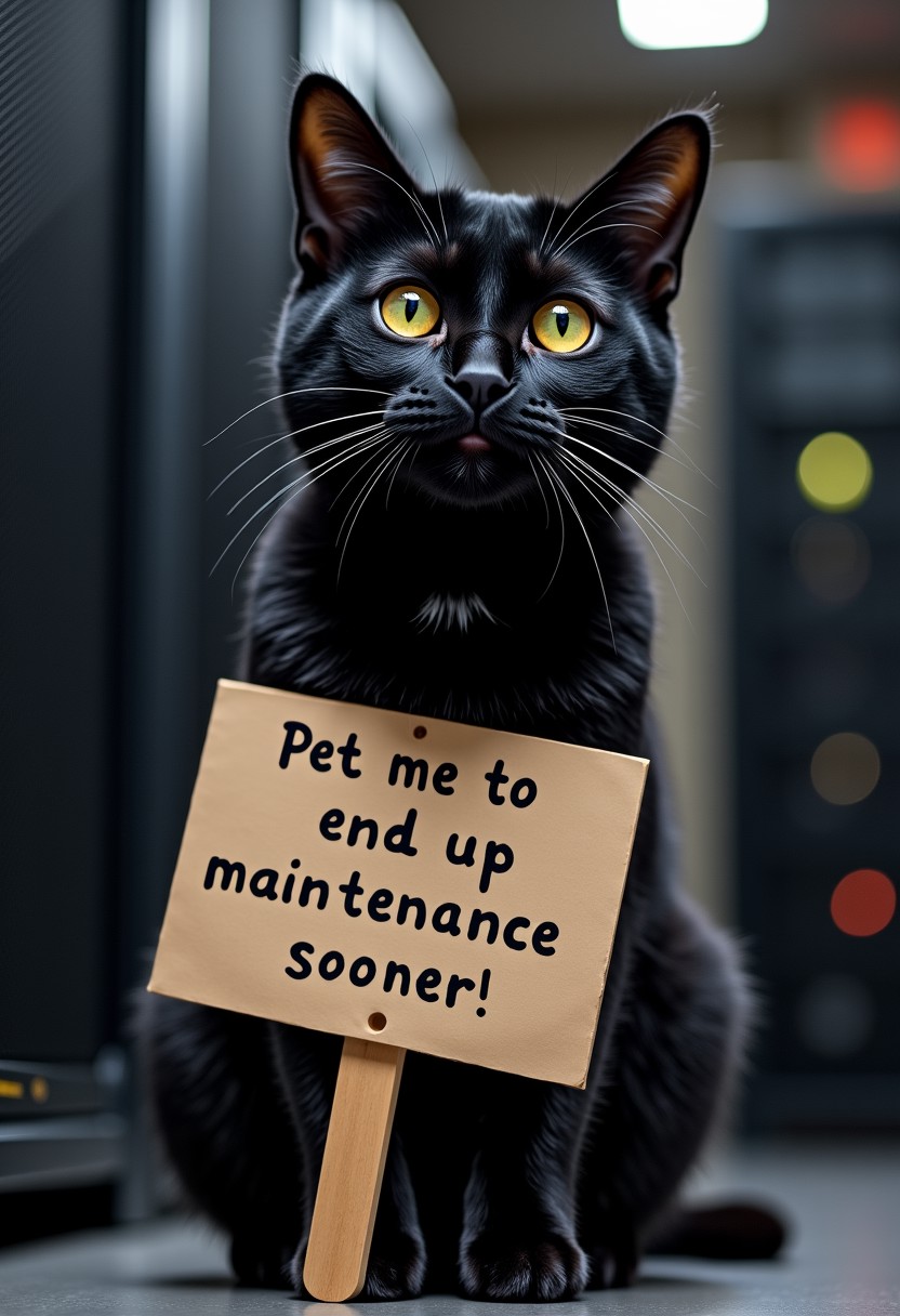 black cat with a sign, text on sign "Pet me to end up maintenance sooner", cat sitting in a server room, very confused cat expressions,