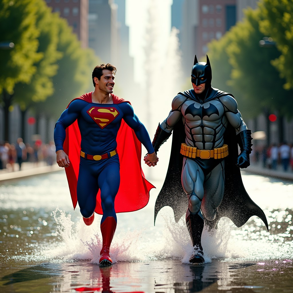 ((superman)) and ((batman)) are running through city park fountain, holding hands, both are wet and smiling, vivid colors, realistic, photorealistic, high definition, film grain