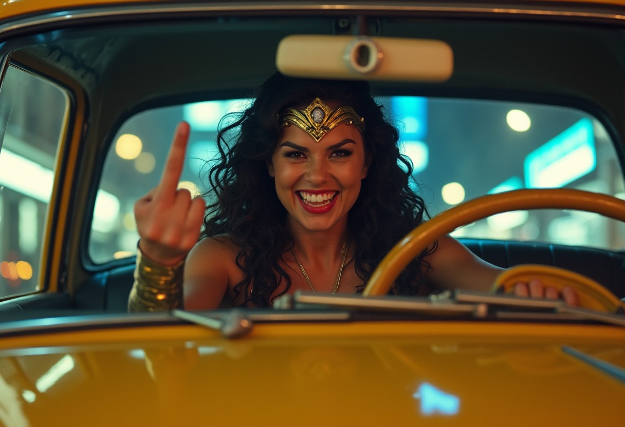 cinematic shot, backlight, dramatic lights, view from the front windshoeld, Wonder Woman, angry, grin, madness, heavy traffic, showing middle finger, driving a old used yellow taxi through a bustling metropolis. iconic tiara. The contrast between her powerful, heroic persona and the mundane task of driving a taxi creates a striking juxtaposition. windows reflections, Dynamic composition, realistic lighting, hyperrealistic details, 8K, art by Alex Ross, trending on ArtStation.