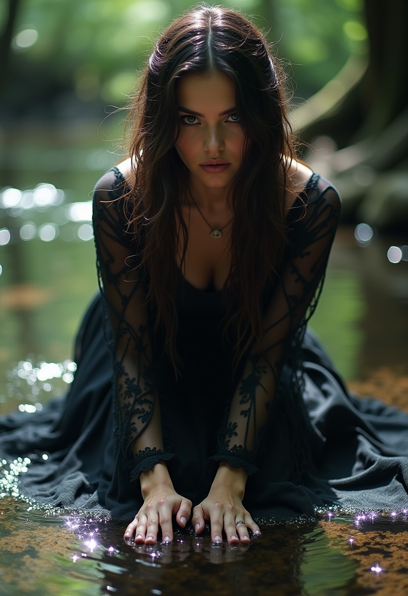A mesmerizing witch kneels by an enchanted stream in the forest, the water shimmering with an otherworldly light. Her graceful hands dip into the water, creating ripples that catch the light, shadows of overhanging branches cast delicate patterns on her skin, reflections of the magical water dance in her eyes, the atmosphere serene and mystical, close-up, gentle, shimmering light.