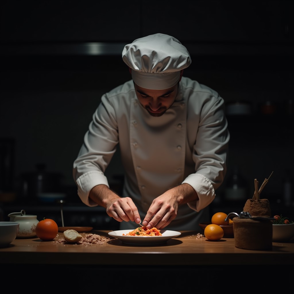 realistic shot of a Culinary chef cooking in a kitchen,soft lighting, dark background, still life photography, minimalist style, closeup shots, commercial advertising, high-definition images, rich details, exquisite textures, high saturation, symmetrical composition in the style of minimalism.