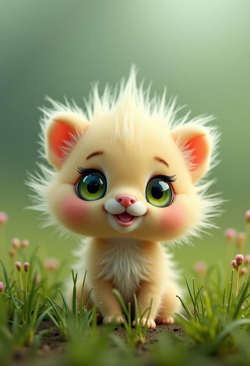Cute fluffy Chibi, caricature style on the screen, clear lime eyes, hiding in the grass, the fragility of film films, 3 spoiled frames on old projector films from Anna Millen and George Cruickshank, Bordello II and Brian Froude, smooth frame, cropping cracked varnish. clear focus, artforum trend, behance HD, muted background colors