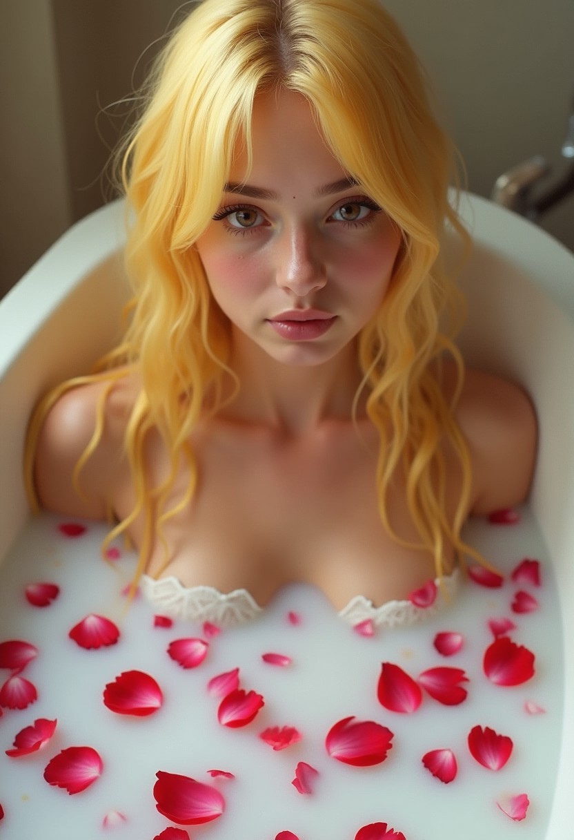 raw photo, glamour photography, 1girl submerged in milk bath with rose petals,(real:1) , Adaptation of the character Tsunade from the anime Naruto, yellow hair, brown eyes, the general style of Tsunade from the anime Naruto,