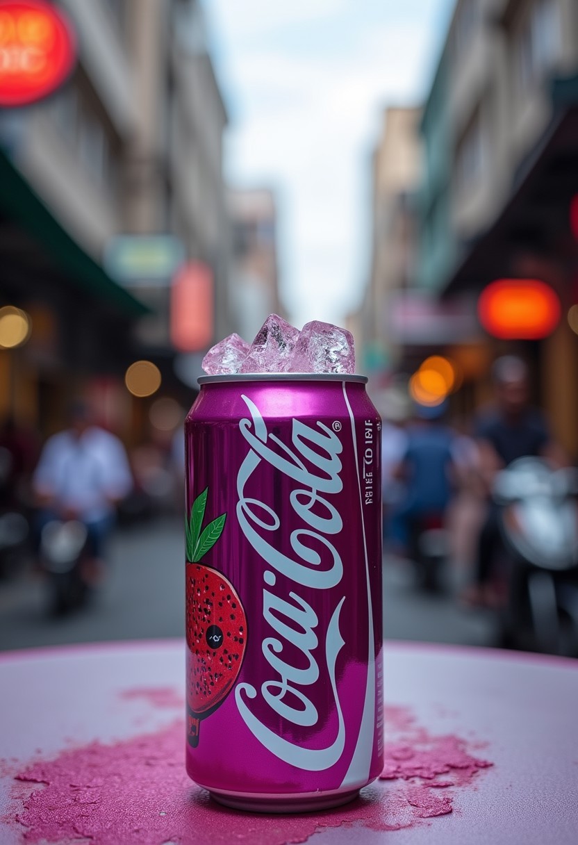 a product pack shot, product advertisement photo, a purple coca cola can with the text \"Coca Cola Devil Fruit\" with the image of Gum-Gum Devil Fruit print on the can, ice chilled can placed on a table with crowded bangkok street traffic background, short focus