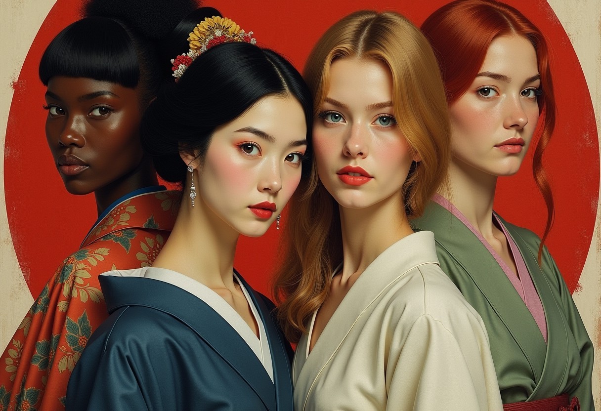 painting of 4 people, samurai, black African woman with a asian woman from japan on the left, (asian woman:1.5), blonde woman with blue eyes with a red haired woman with green eyes on the right, (blonde woman with blue eyes, red haired woman with green eyes:1.2), (William Adolphe Bouguereau:0.7), (Norman Rockwell:1.5), (japanese art:1.4)