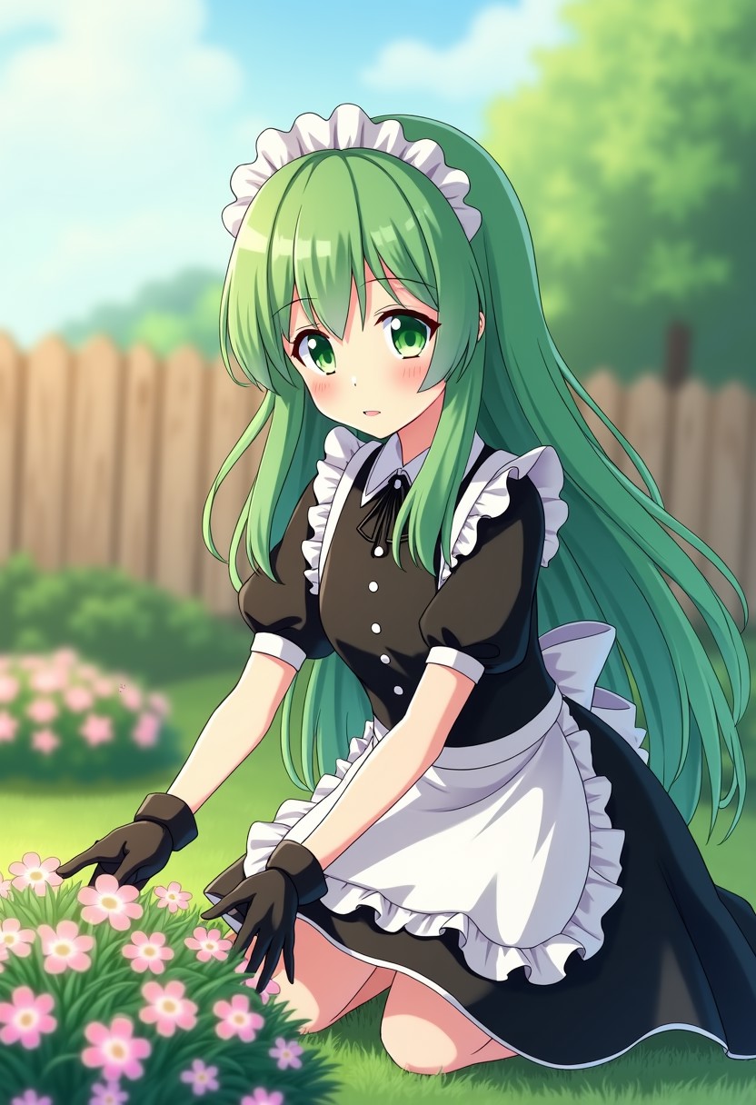 anime, a maid with long green hair and green eyes, wearing short sleeved black dress and black gloves, picking up flowers in the garden