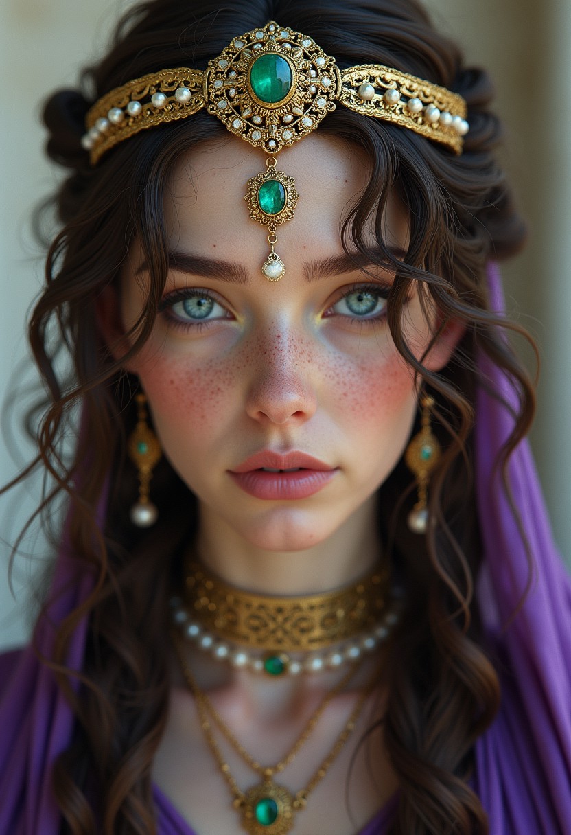 Extreme closeup upper body portrait, gold filigree, 25 year old druidic priestess oracle, greek woman with long curled hair, adorned with purple silk, pearls and emerald gemstones, circlet, standing in byzantine white marble temple, by Brian Froud and Heather Theurer, extremely detailed head and freckled face, skin pores, parted lips, very realistic and symmetrical eyes, large glowing blue eyes, enchanting eyes, (eye contact with viewer), hyper detailed, hyper quality, artstation award winner, Epic realism, meticulous masterpiece, film grain,