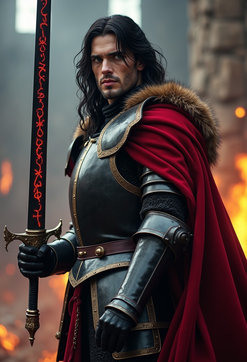 Henry Cavill as a European male vampire high fantasy knight with pale skin wearing black armor with brass trim, no helmet, he is tall and muscular, he has long black hair and blue eyes, the knight is wearing a red cloak with brown fur trim, he is holding an ornate magic sword with a black blade covered in glowing red runes, he is in a fighting stance, the knight is in a burning castle under siege