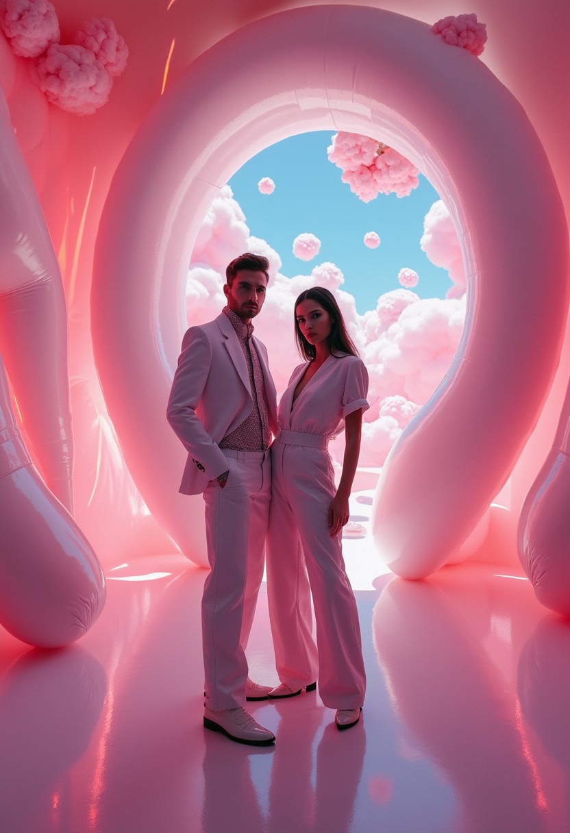 Style: Surreal, futuristic, and high-fashion Scene: A stylish couple poses in a surreal room. The walls are inflatable, with a soft, glossy finish, and vibrant laser beams crisscross through the space, casting dramatic reflections and shadows. Behind them, a portal opens to another world filled with candy cotton clouds and floating pink elephants, adding a whimsical, otherworldly element to the scene. Mood: The atmosphere is a blend of high-fashion elegance and playful surrealism, creating a striking contrast between the sleek, sophisticated poses of the models and the fantastical, dreamlike environment around them.