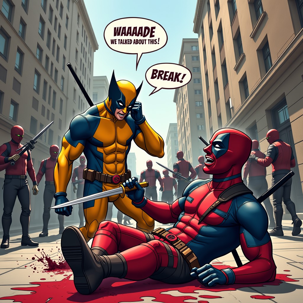 score_7, score_8, score_8, masterpiece, in the streets, fights all around the scene, destruction in the buildings, BREAK Hugh Jackman in a yellow and blue wolverine bodysuit is facepalming his face, facepalm, slightly angry face, bubble text saying (WAAAADE WE TALKED ABOUT THIS!) BREAK Ryan reynolds's Deadpool is in the foreground stabbing a mercenary with his sword, sword passed through the torso, blood spilling around him and on his clothes, Deadpool looks happy and is giggling with his hand on his mouth