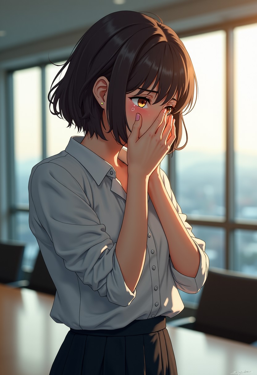 {photorealistic}, raw photo, 1girl, woman, 36yo, small breasts, short brunette hair, brown eyes, standning in the conference room, office shirt, office skirt, meeting, (crying), windows, from side, (tears flowing), face in hands, text at the bottom: "Sometimes you have to make choices"